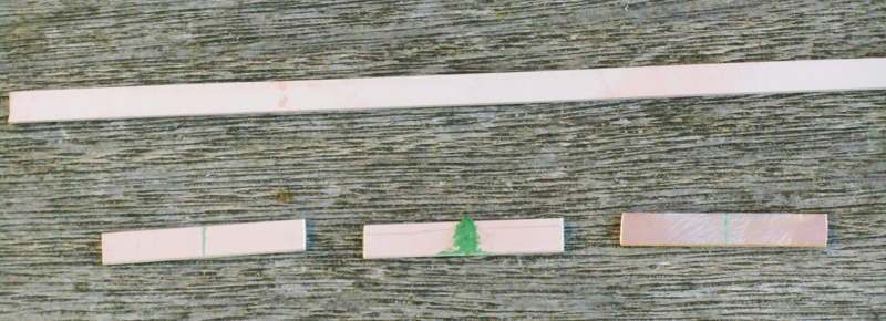 Copper clad sleeper strip (top), cut to length and gapped (bottom left), gap filled (bottom middle) and smoothed-off (bottom right).